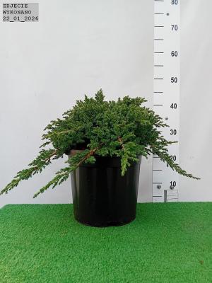 Zimozielony. niski i wolnorosnący jałowiec o pełzających pędach. Ozdobny w zielononiebieskie. krótkie igły. Wzrost do 0.2 m wysokości przy 1.5 m średnicy. Plecany na skalniaki. a w formie szczepionej na balkony i tarasy.