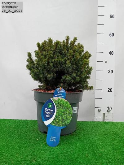 Karłowy świerk biały o kulistym pokroju. Osiąga 0.3 m średnicy po 10 latach. Posiada cienkie pędy i krótkie zielone igły. Polecany na skalniaki i do pojemników.