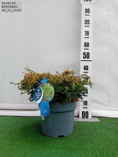 Zimozielony wolnorosnący cyprysik o płaskokulistym pokroju. dobrze zagęszczony. Pędy nitkowate. proste. Ulistnienie łuskowate. złocistożółte do jasnozielonożółtego. Po 10 latach dorasta do 0.6 m wysokości i 0.7 m średnicy. Nadaje się mieszanych kompozycji