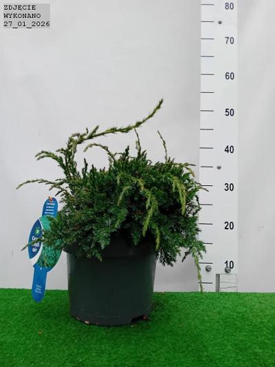 Zimozielony. silnierosnący jałowiec o płożącym pokroju. Ozdobny w srebrzystoniebieskie igiełkowe ulistnienie. Wzrost do 0.3 m wysokości przy 2 m średnicy. Polecany do większych ogrodów. na skalniaki oraz jako roślina okrywowa.