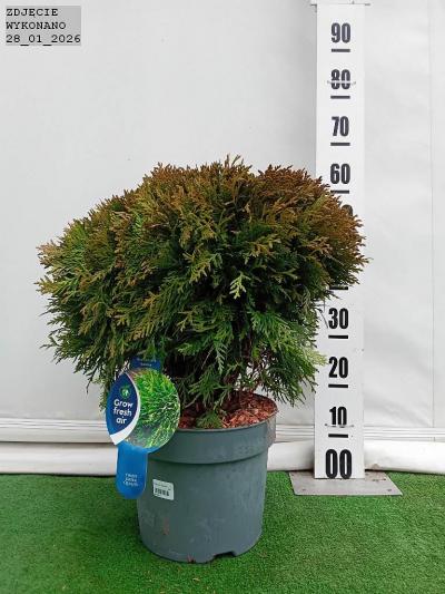 Żywotnik zachodni. potocznie tuja. należy do gatunku zimozielonego drzewa o pokroju w zależności od odmiany. np: kolumnowym. stożkowym. kulistym. Charakteryzuje go czerwonobrązowa czasem jasnobrązowa łuszcząca się płatami kora oraz krótkie. spłaszczone pę