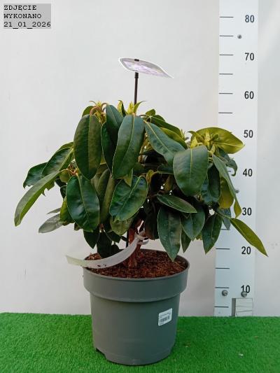 "Zimozielony różanecznik z rodziny wrzosowatych o zwartym pokroju przez cały okres wzrostu. charakteryzujący się ciemnozielonymi. skórzastymi liśćmi. Ozdobą różaneczników są przede wszystkim kwiaty. zebrane w obfite. wielobarwne kwiatostany na szczytach p