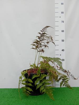 liście podwójnie pierzaste. srebrzysto zielone z czerwonym unerwieniem liści paproć dorastająca do 0.4 - 0.6 m wys..