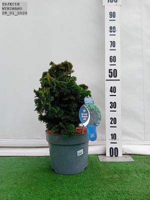 Zimozielony bardzo wolnorosnący cyprysik o szerokostożkowym pokroju. Rozgałęzienia krótkie. błyszczące. ciemnozielone. muszlowato skręcone. Po 10 latach dorasta do 0.5 m wysokości. Szczególnie polecany do małych ogrodów przydomowych i ogrodów japońskich