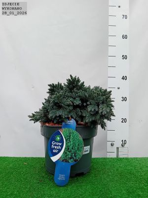 Zimozielony. karłowy jałowiec o prawie kulistym pokroju. Ozdobny w srebrzystoniebieskie. kłujące igiełkowe ulistnienie oraz krótkie. ale bardzo gęste pędy. Wzrost do 0.3 m wysokości przy 0.5 m średnicy. Doskonały na skalniaki i cmentarze oraz do pojemnikó