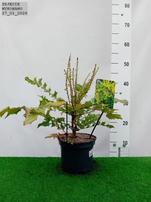 Zimozielona mahonia o zwartym pokroju i prostych pędach. Wzrost do 1.5 m wysokości. Ozdobna w skórzaste i ząbkowane listki oraz w żółte. dzwonkowate. pachnące jak konwalie kwiaty. przyciągające pszczoły. Nadaje się na solitery. do nasadzeń grupowych oraz