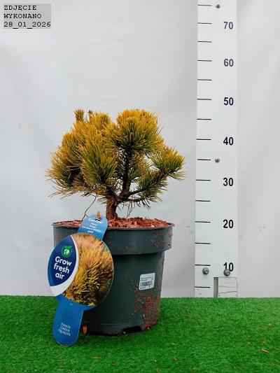 Karłowa sosna kosodrzewina o zwartym krzaczastym pokroju i wzniesionych końcówkach pędów. Po 10 latach dorasta do 0.75 m wyskości i szerokości. Posiada podwójne igły. latem jasnozielone a po jesiennych przymrozkach pomarańczowozłote. Takie wybarwienie poj