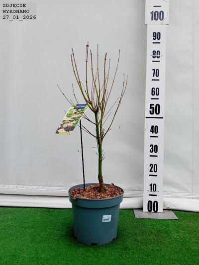 Wolnorosnący klon o wzniesionym pokroju. Liście głęboko powcinane. 7-klapowe. o klapach jajowatych z ostro zakończonymi koniuszkami. Wiosenne zabarwienie liści jest intensywnie pomarańczowe. później przechodzące do jasnożółtego z pomarańczowym brzegiem. D