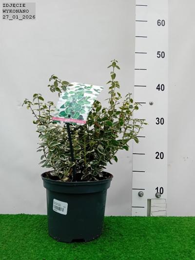 Zimozielona trzmielina z pędami płożącymi się po ziemi. Ozdobna w szerokojajowate. błyszczące. dość grube. ciemnozielone liście z białym nieregularnym marginesem. jesienią fioletowe. Dobrze znosi cięcie i formowanie. Wzrost do 1 m wysokości i 2 m szerokoś